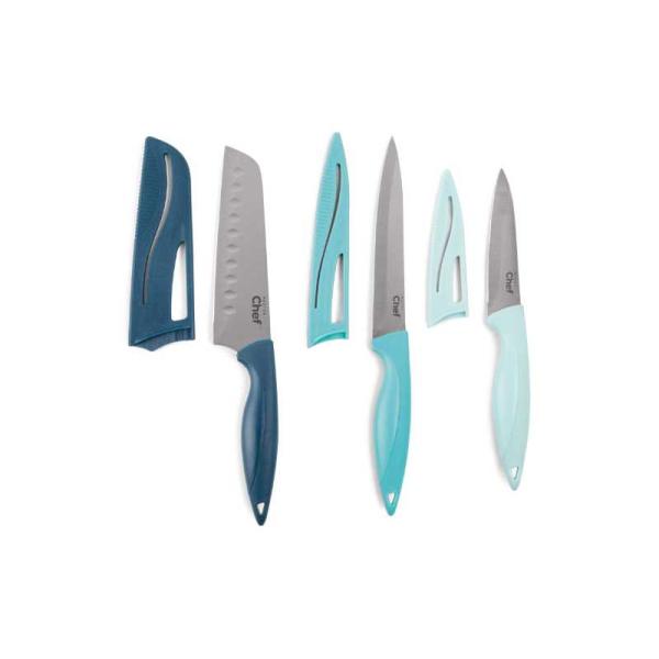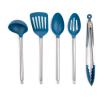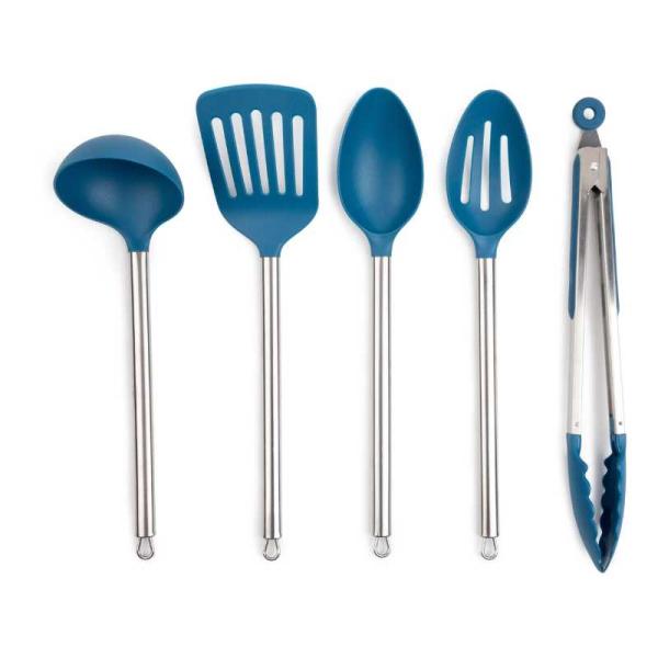 Cooking pot, Frying pan, Cutting board, Kitchen knives with sheaths, Wooden spoons, Spatula, Ladle, Food grater, Food peeler, Measuring cups and spoons, Oven mits, Kitchen scissors, Tongs, Can-opener